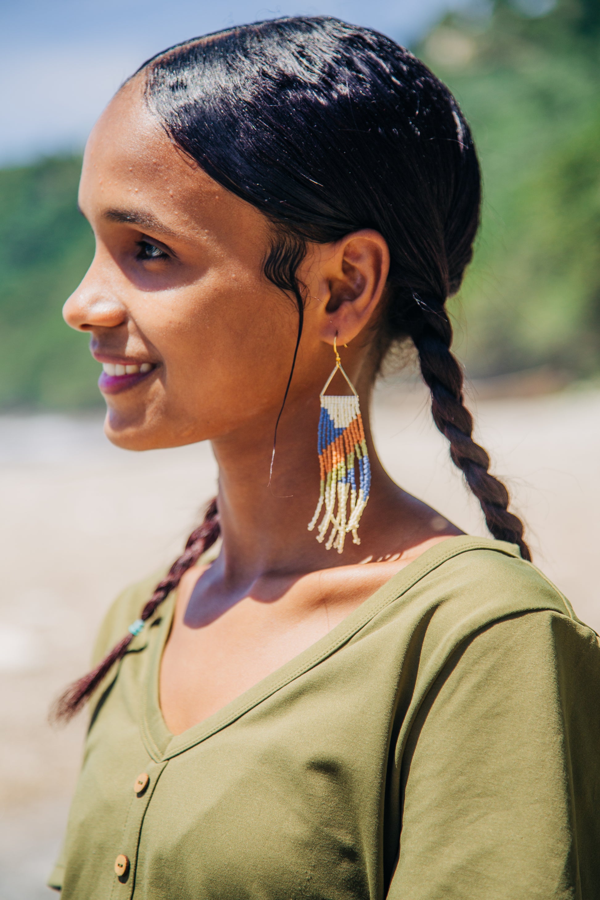 The Claribel Beaded Dangles feature a distinctive triangle charm complemented by long strands of seed beads exhibiting a unique cross horizontal pattern. This unique design creates a bold statement piece that exemplifies expert hand-beading and refined artistry, perfect for those seeking sophisticated and eye-catching jewelry.