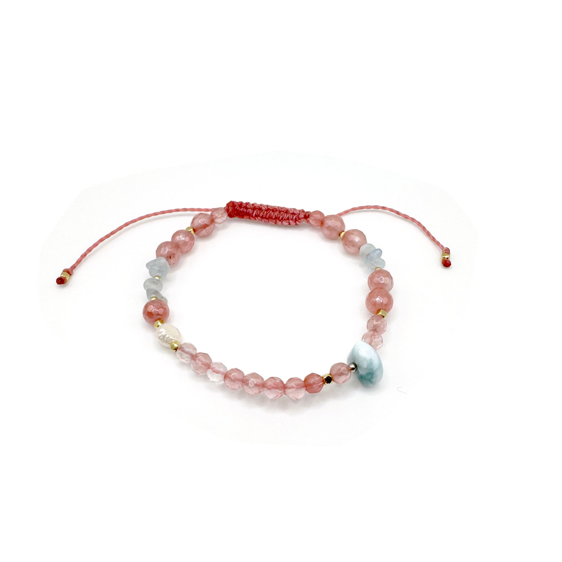 Materials: Cherry quartz, aquamarine, Larimar, freshwater pearl, 14k gold-plated findings and pink Brazilian wax cord.